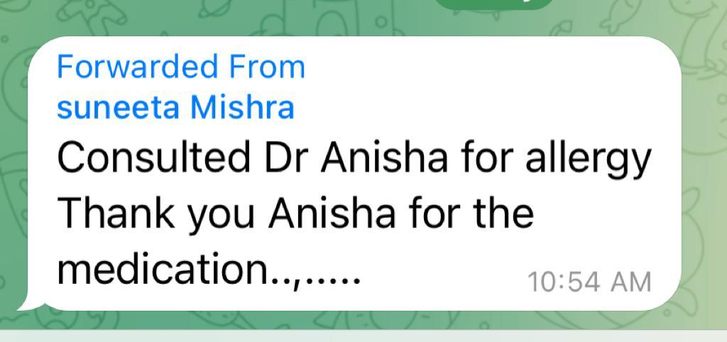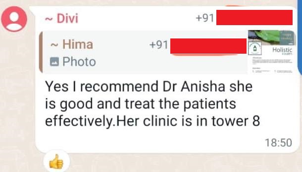 I have known Dr. Anisha for more than 5 years. My mother had faith in Homeopathy as it cures the root cause of the problem and has no side effects. I got a testimony of it when I got my treatment from Dr. Anisha. I am thrilled and worry-free knowing that an extremely able Dr. Anisha is always selflessly treating us from thousands of miles away. I am deeply grateful for everything you have done for me!" I cannot thank the doctor enough.